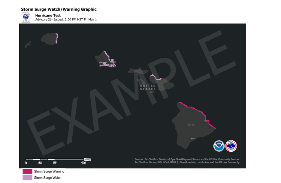 An example storm surge watch and warning for the Hawai’ian Islands, image credit: NOAA National Hurricane Center.